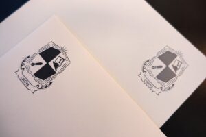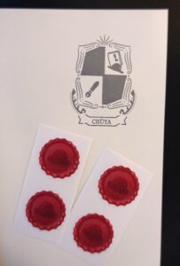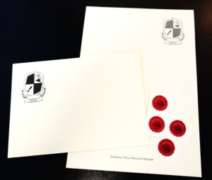 【チューヤエンブレム】 筆まめだった中也は、友人や家族へたくさんの手紙を送っていました。 そのなかには、中也がよく行っていた「新宿中村屋」のマーク入りレターセットに書かれた手紙が遺されており、そのデザインをイメージしています。 エンブレムは中也のぼうし、『山羊の歌』、万年筆が入った当館オリジナル。 中也みたいに、誰かに手紙を書いてみませんか。 (A5サイズ便せん8枚(1種)、洋2封筒4枚(1種)、シール4枚入り)